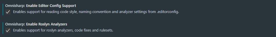 ctrl + shift + pand enter the command> Preferences: Open User Settings. - Search for OmniSharp and make sure the two boxes are ticked like the image below.